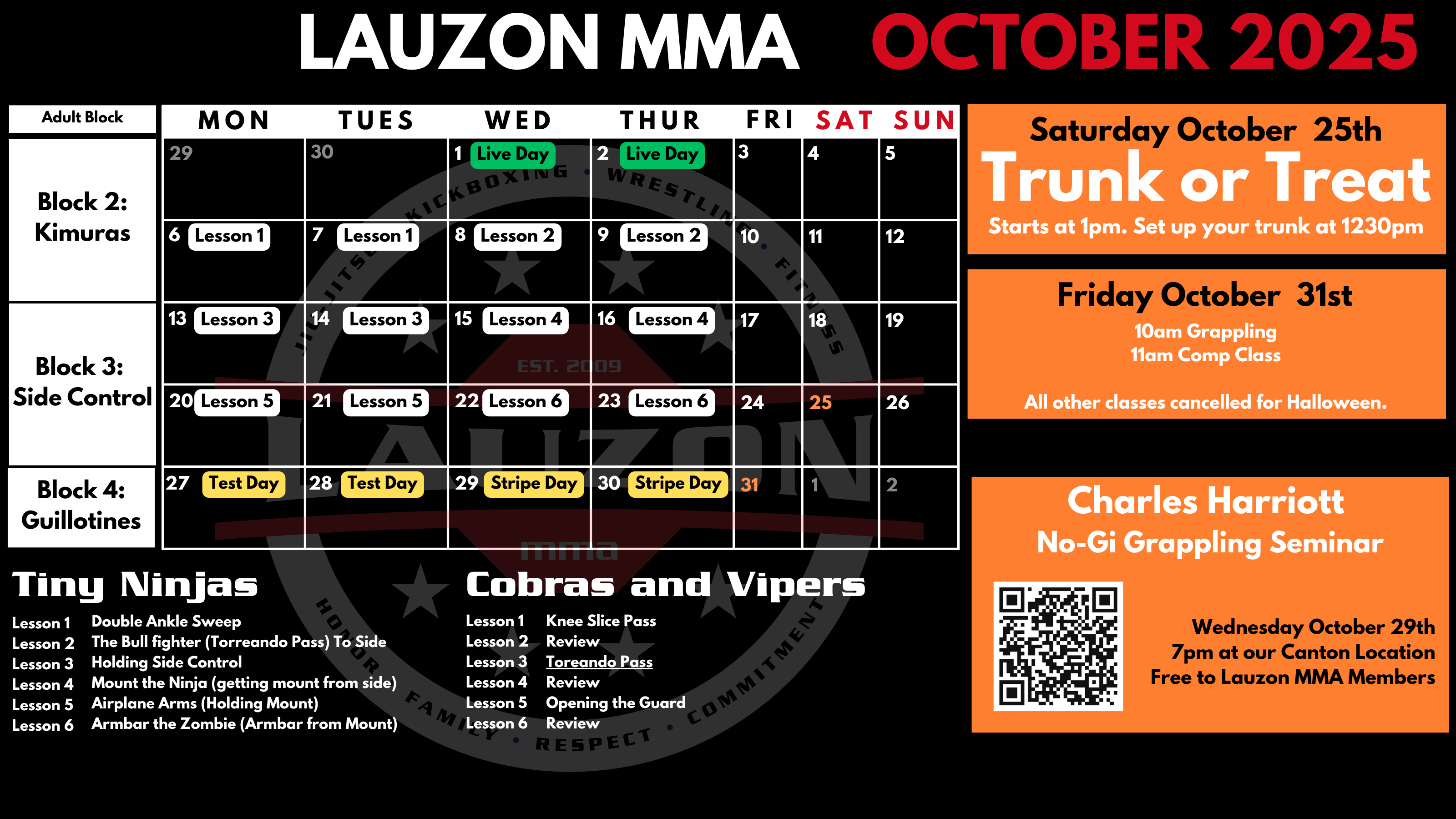 Finally, a quick note for Halloween — on Friday, October 31st, we’ll have a modified schedule. Our 10 AM No-Gi and 11 AM Comp Class will run as usual, but all other classes will be cancelled that day. Enjoy your night of costumes and candy!