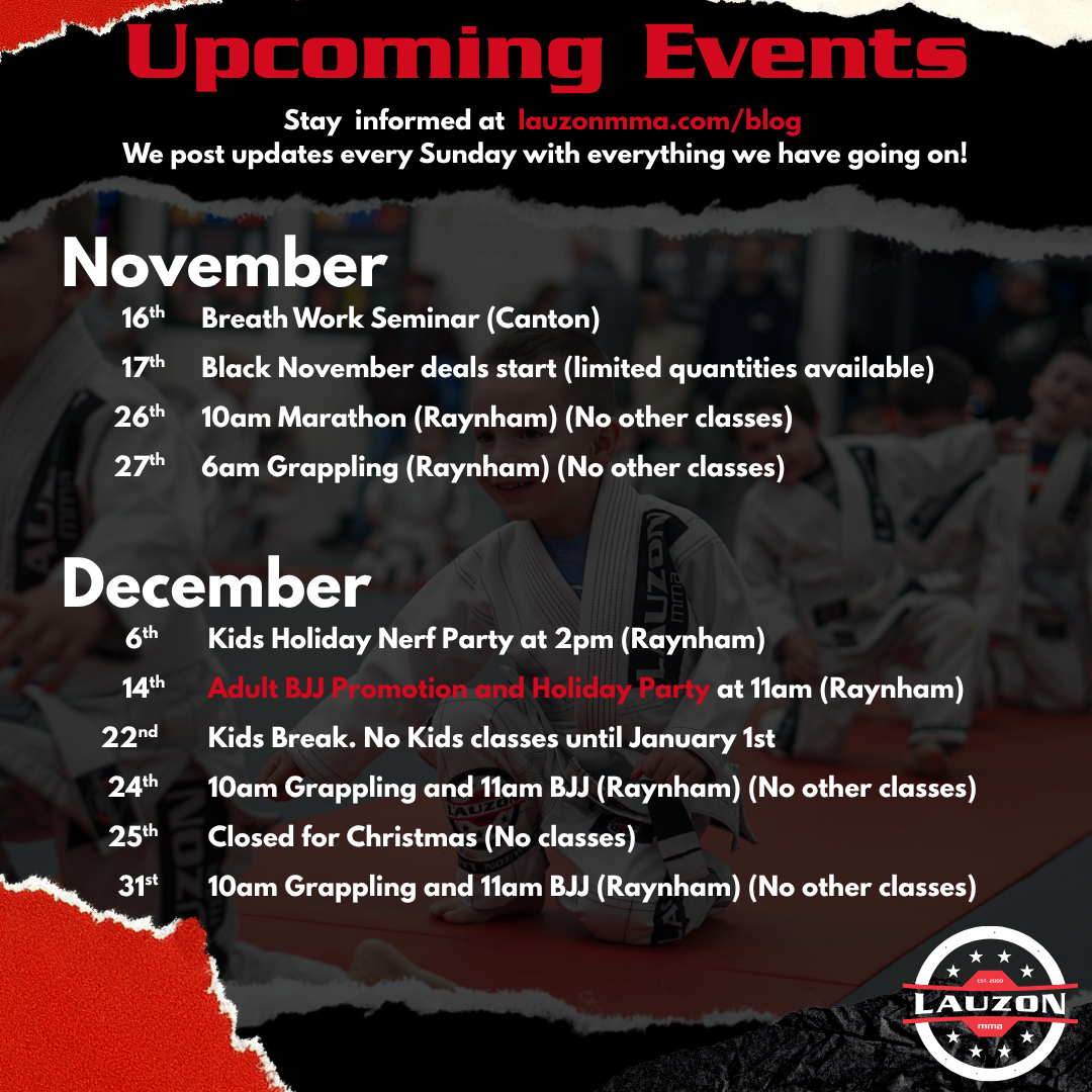 Looking ahead, our Adult BJJ Promotion will be held on Sunday, December 14th at 11am in Raynham, followed by a holiday celebration. We hope you’ll join us to support your teammates, hang out, and enjoy the day. You can find the event details here.
